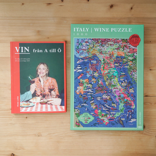Sedan kan den som ska firas få koppla av vid pusselbordet med det svala vinet i sitt glas och låta ögonen vila på vackra illustrationer och drömma sig bort till italienska vindistrikt.