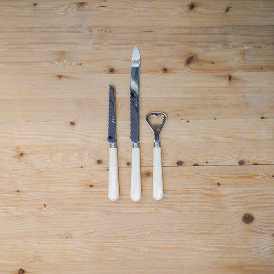Ett kit i pärlemor! Sabre Paris högklassiga köksverktyg tomatkniven, brödkniven och kapsylöppnaren utgör en gåva svår att inte tycka om.