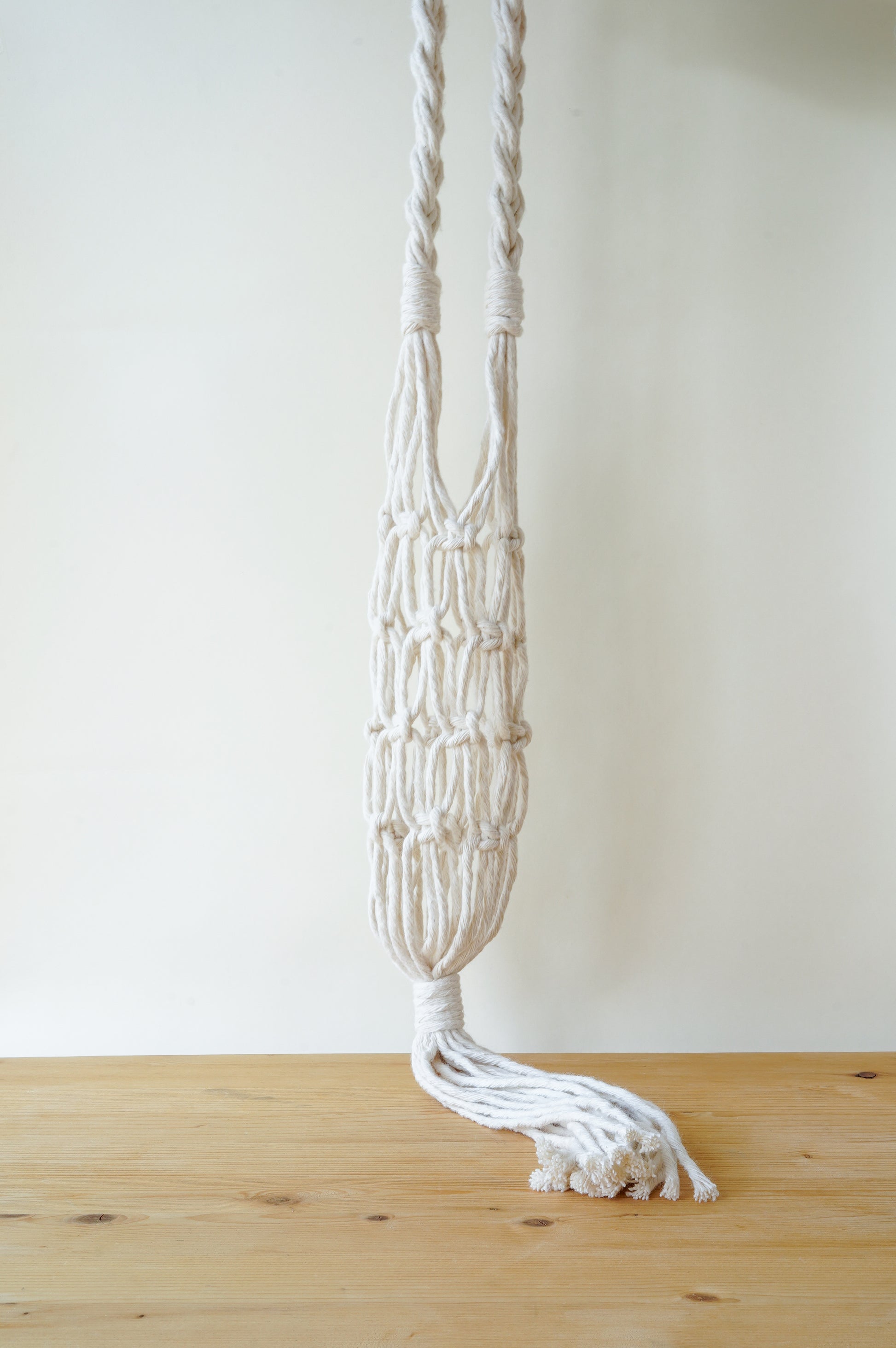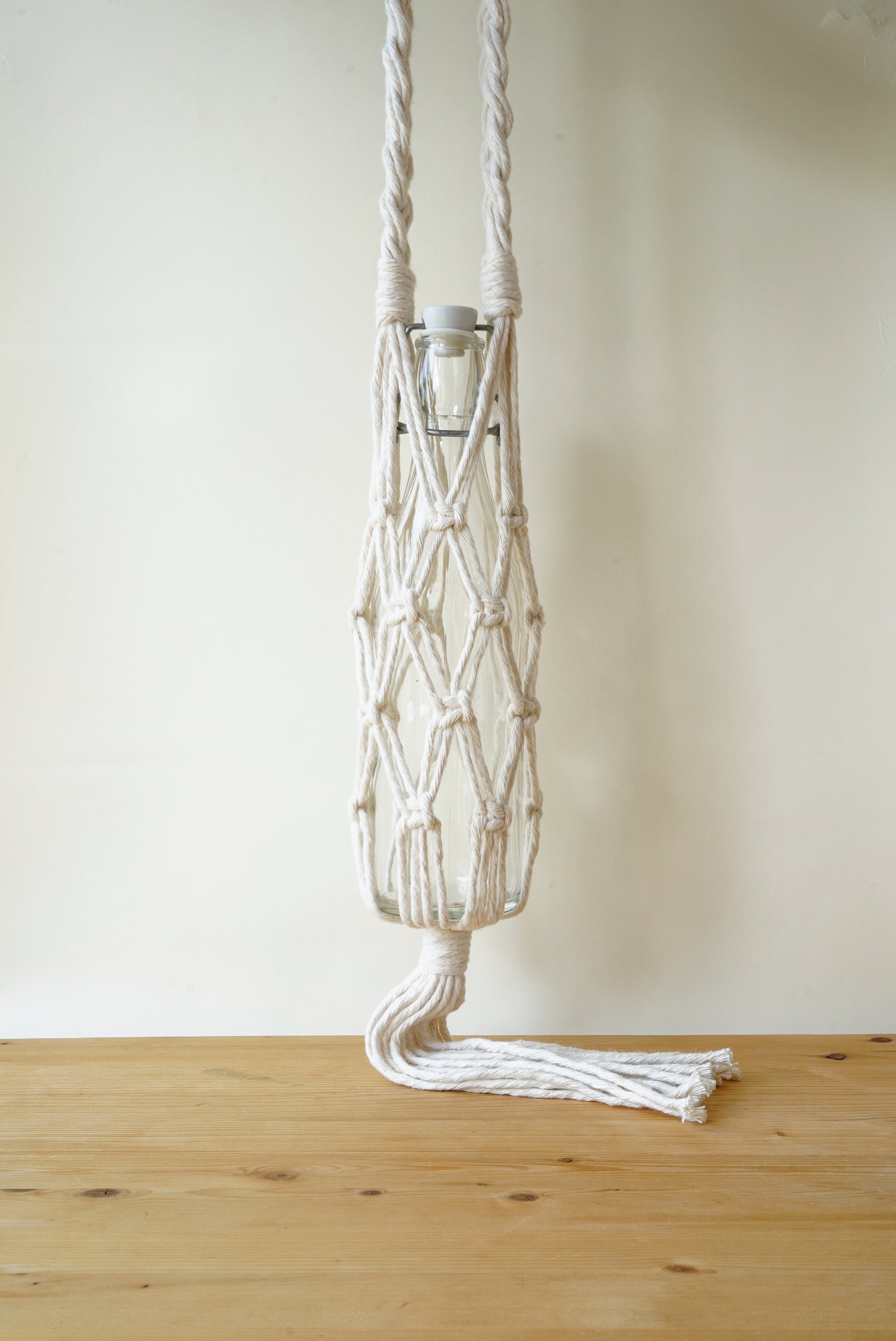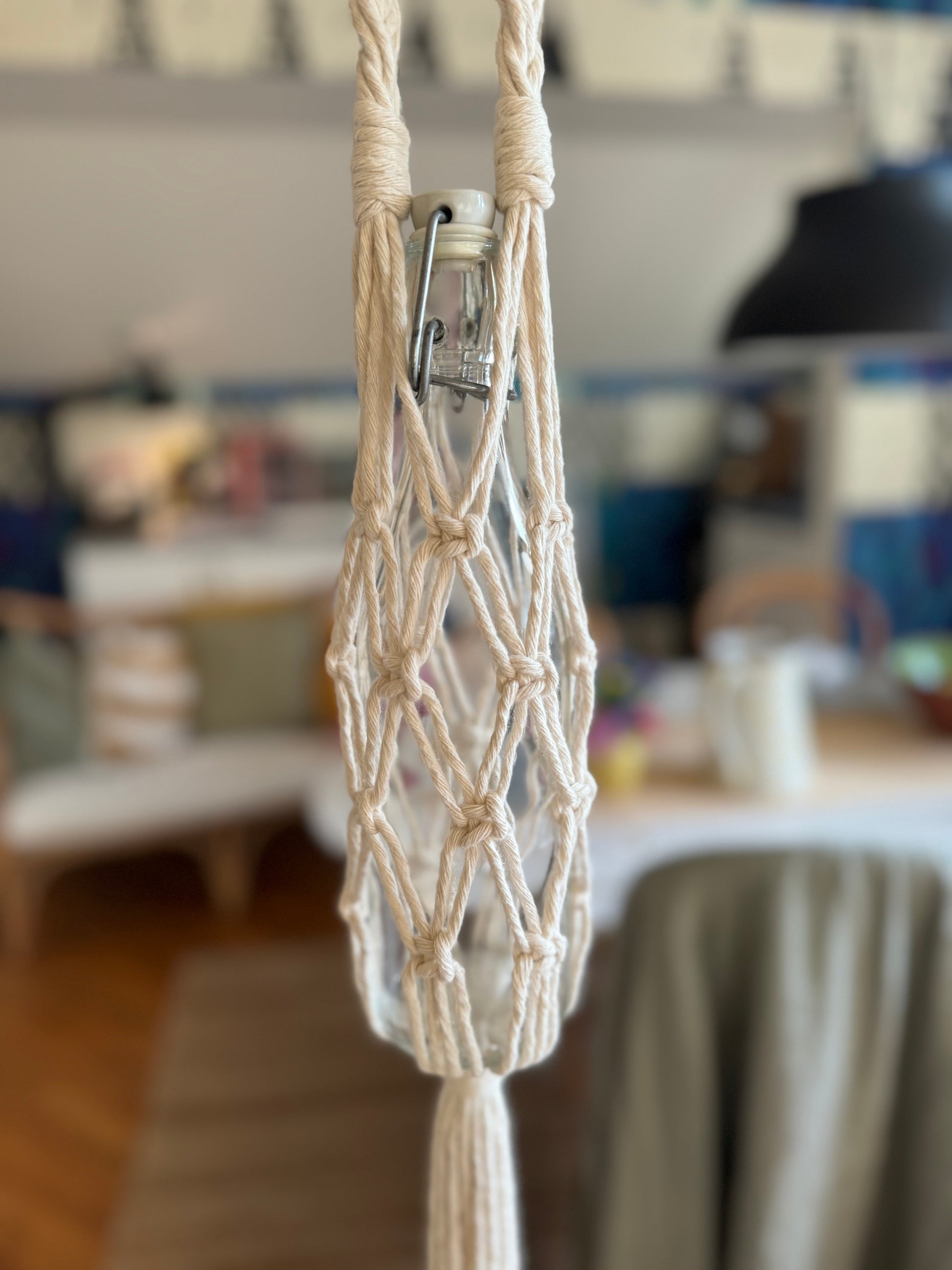 Den här helt unika makraméväskan har jag knutit för hand i en garn av återvunnet bomull. Och den går ju faktiskt lika bra att ha till vattenflaskan på yogan.